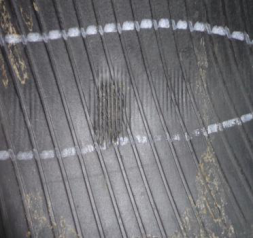 轮胎胎里靠近胎肩部位,局部可以清楚看到胎体帘线排列情况,内衬层沿着漏线的部位断裂,漏线部位对应的胎侧出现“U”形爆破现象。