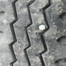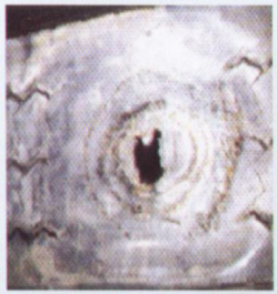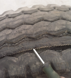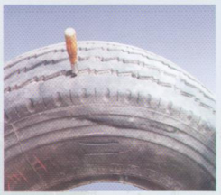 轮胎行驶过程中,胎冠被钉子、铁块等尖锐物体刺扎,并刺透带束层和胎体钢丝。