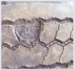 轮胎表面受到机油、电解质、强酸、强碱或有机溶剂的侵蚀后,行驶时造成局部改性的胶料脱落。