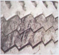 轮胎胎面花纹边缘,沿周向鱼鳞状磨损。